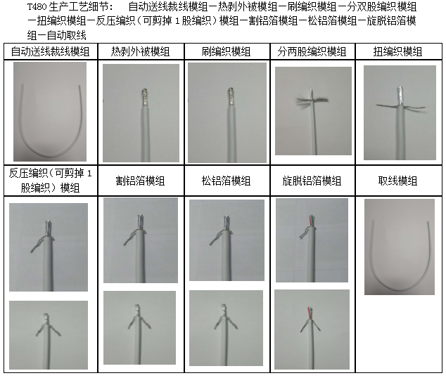生產(chǎn)工藝細(xì)節(jié): 自動(dòng)送線裁線模組—熱剝外被模組—刷編織模組—分雙股編織模組—扭編織模組—反壓編織(可剪掉1股編織)模組—割鋁箔模組—松鋁箔模組—旋脫鋁箔模組—自動(dòng)取線